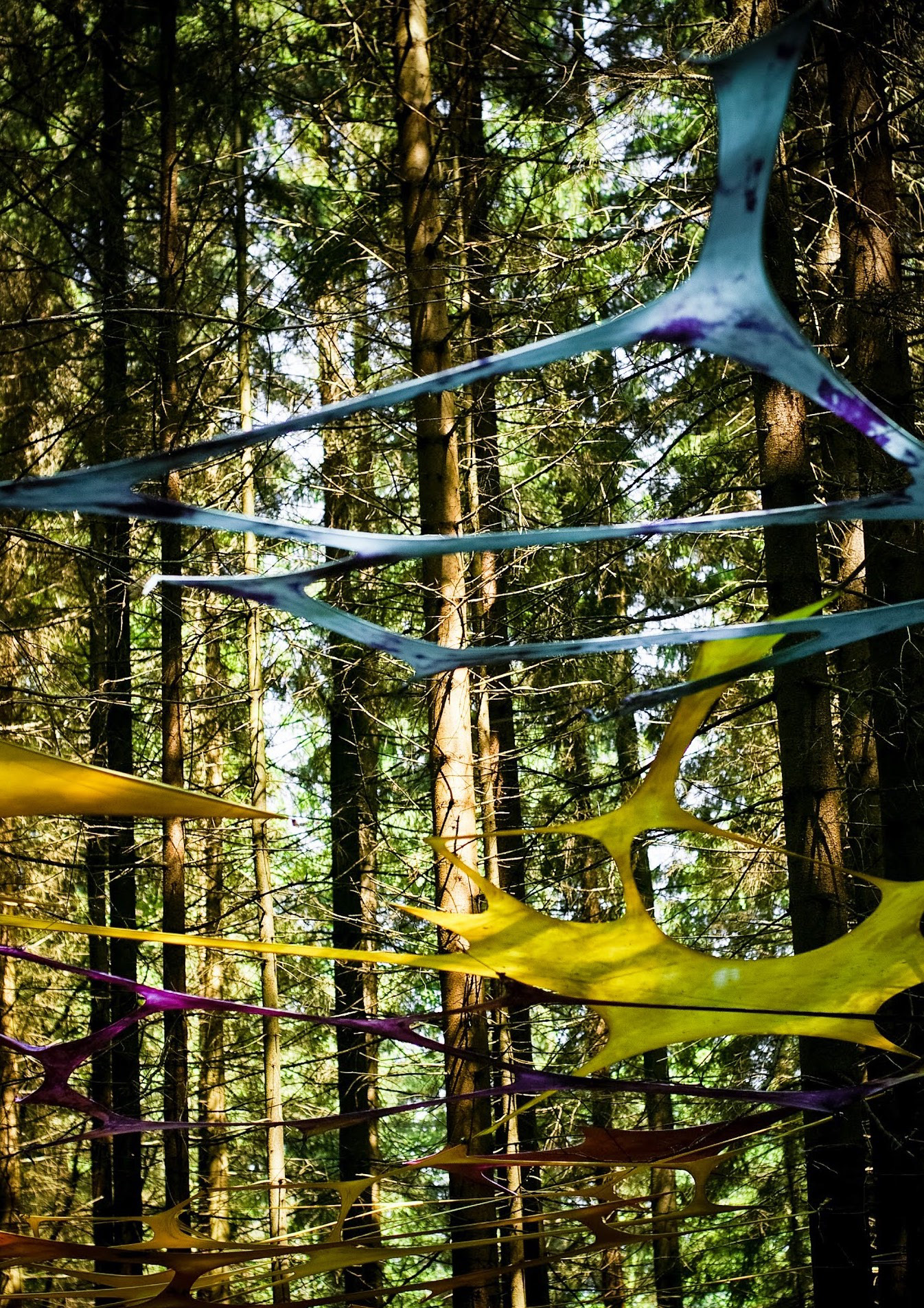 The direct inspiration for the project came last year when I was visiting my parents in Lithuania, staying at their house outside Vilnius, with a view from my window over the forest that dressed beautifully in fog during early dusk hours. In many of my projects, I explore the theme of “home” and what it means emotionally. And I must say that I subconsciously associate pine trees and fir trees with the notion of familiarity and calm. There is also a part of me that spent summers in the deep Lithuanian forests at underground psytrance and techno music festivals. The colorful hand-made decor of these festivals fitted so masterfully with nature as if it was an illustration of godly forces and souls inhabiting these places.
